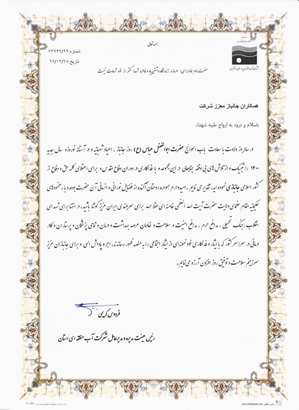 در سالروز ولادت با سعادت باب الحوائج حضرت ابوالفضل عباس (ع) روز جانباز ، اعیاد شعبانیه و در آستانه نوروزو سال جدید 1400 را تبریک و از تلاش های بی وقفه جنابعالی در این مجموعه و با فداکاری در دوران دفاع مقدس و برای اعتلای کلمه حق و دفاع از کشور اسلامی جانبازی نموده اید، تقدیر می نمایم .امیدوارم همواره روحتان آکنده از فضایل نورانی و انسانی آن حضرت بوده و با رهنمودهای حکیمانیه مقام عظمای ولایت حضرت آیت الله العظمی خامنه ای حفظ الله برای سربلندی ایران عزیز کوشا باشید. در انتها برای شهدای انقلاب ،جنگ تحمیلی ، مدافع حرم ، مدافع امنیت و سلامت و خادمان عرصه بهداشت و درمان و تمامی پزشکان و پرستاران و کادر درمانی در سراسر کشور که با ایثار و فداکاری خود نمونهای از ایثار اجتماعی را به منصه ظهور رساندند، اجر و پاداش الهی و برای جانبازان عزیز سرزمینم سلامت و توفیق روز افزون آرزو مینمایم.